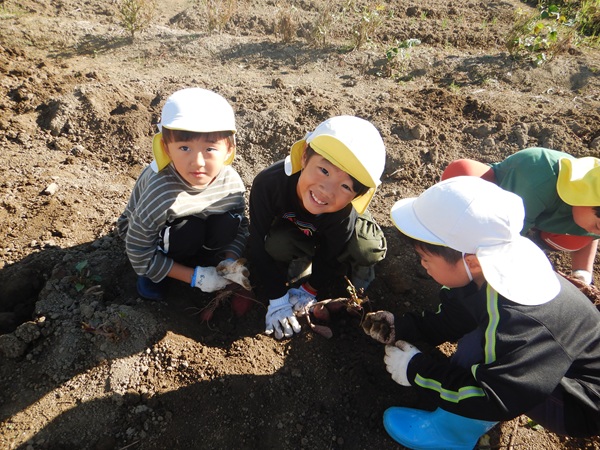 5月に苗植えを行い5か月ほどが経ちました。今日は子どもたちが成長を楽しみにしていた芋掘りです!!天候のせいで少し土が固く掘りにくかったけれど、元気パワー全開で掘り進めていき、たくさんのお芋を収穫することができました。ゆり組さくら組さんはおみやげに持って帰ることもできましたよ。