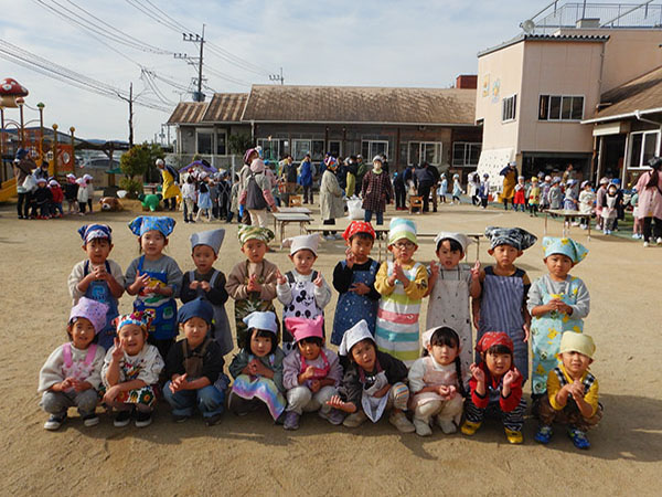 晴天のなか、園庭で餅つきを行いました。エプロンに三角巾姿になった子どもたちは、餅つきの手順やお約束を聞いてさっそく餅つき開始!!